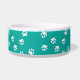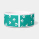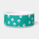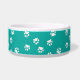 Esta bacia grande-feita sob medida do cão tem um fundo de turquesa com impressões brancos da pata nela. Grande tamanho para variedades maiores do cão. Guardara 40 onças da comida e é material cerâmico branco. É seguro para a microonda e a máquina de lavar louça também.