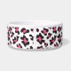 Esta bacia cerâmica do alimento para cães tem um teste padrão preto, cor-de-rosa e branco à moda do impressão da chita no fundo. No meio, há um grande osso branco com um nome facilmente personalizado de seu cachorrinho escrito no rosa.