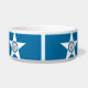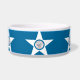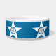 Pet Bowl com bandeira de Houston, Texas; bandeira azul com selo de Houston numa estrela branca, com ilustração de um trem