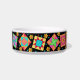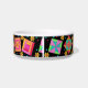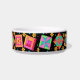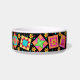 Desfrute do seu amor por colchar quando você alimenta seu gato com este prato de comida de estimação. Esta arte em forma de colcha combina blocos de retalhos favoritos, picados e apiquados, e blocos únicos em cores vibrantes e dinâmicas, cor rosa, laranja, turquesa, verde e amarelo em fundo preto. Esta design é a arte original da designer de tecidos Phyllis Dobbs. Personalizável.
