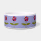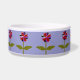 Esta incrível tigela de estimação apresenta uma imagem digital de uma margarida com um tronco verde com duas folhas verdes sobre ela e pétalas roxas, vermelhas e pretas coloridas com um centro roxo. As pétalas parecem feitas de plástico brilhante que pegou a luz e causou um efeito iridescente. O fundo é uma cor azul calmante.