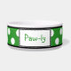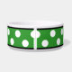 Na moda cerâmica de tigela de cachorro projetada com um padrão de bolinhas branco grande sobre verde e personalizada com o nome de seu animal de estimação.
