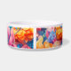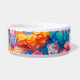 Uma tigela de estimação com uma coleção colorida de primavera e flores de verão. Cor de laranja rosa e azul dominam o esquema de cores. Um arranjo floral brilhante e ousado exude felicidade. :)
