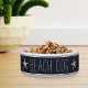 Uma tigela de cachorro de estilo costeiro bonito para sua casa de praia ou moradia insular mostra as palavras "cão de praia" em letras brancas no estilo da fazenda em um fundo azul marinho acentuado com listras estreitas e um par de estrelas brancas.