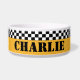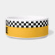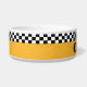 Adicione um estilo Vintage NYC ao tempo jante do seu animal de estimação. A cor do táxi amarelo brilhante tradicional e as faixas do tabuleiro de xadrez são o estilo clássico do taxi do verificador. Completar a aparência nostálgica de vintage é o nome do seu animal de estimação em letra stencil. Bipe - é hora de jantar!