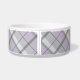 Esta tigela de animais tem um padrão de estilo na moda tartan / xadrez em cinzas e esquema de cor roxa. Há também uma faixa preta com uma área de texto personalizável para o nome do animal.