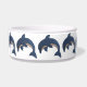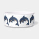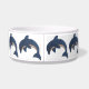 Esta tigela de comida para animais de estimação é circundada por um brilho bonito como golfinhos azul escuro com barrigas brancas em posições de salto que têm olhos giratórios pretos e brancos.