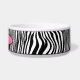 Esta tigela de comida chic e moderna para animais de estimação ou tigela d'água é perfeita para o seu precioso de estimação ou cão de estimação com a sua aparência de na moda. Este design apresenta um padrão de pele de zebra preto e branco, divertido e fabuloso, com um crachá cor-de-rosa para personalizar com o nome do seu bebê de pele favorito.