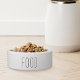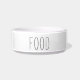 Uma tigela de animais de estimação, de estilo agrícola moderno, para cães ou gatos apresenta "comida" em caracteres de cinza de carvão, de estilo manual.