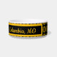 Pet Dish preto e branco com círculos concêntricos preto, dourado e branco design acima de um retângulo preto e dourado com "COLUMBIA, MISSOURI" com logotipos Y-NOT-ME em segundo plano. Esta design é personalizável, é um grito para Columbia, Missouri, uma cidade de campeões.