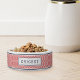Coloque seu pãozinho com nossa tigela personalizada de cachorro, apresentando um padrão de trellis de pré-disquete em coral de verão vibrante e branco, bordado em azul-marinho nítido. Personalize com o nome do seu cachorro na frente.