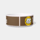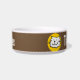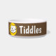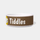 Adicione o nome do seu animal de estimação a esta tigela divertida que apresenta uma ilustração do estilo de desenho animado de um gato sorrindo. Fundo castanho.