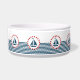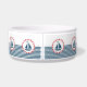 Design náutica com decoração de embarcações à vela em forma redonda, em fundo listrado a azul e a branco