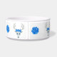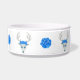 Esta tigela de comida de animais de estimação está cercada de fantasia com cabeças brancas de cervo com grandes galhos brancos, olhos azuis e rosas em suas cabeças. Bonito rosas azuis estão entre os veados.