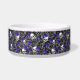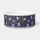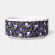 Flores violetas, crânios, e tigela de cão de rendas, com design gótico.