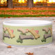 Ossos para o amante de biscoitos. Adicione um pouco de diversão à sua área de jantar com esta tigela fofa. O aglomerado de tons verdes, cor-de-rosa, castanhos e beges coloridos de fotografias ósseas de cães espalha-se ao redor desta tigela janta. Clique em Personalizar! para alterar a cor do plano de fundo para algo que você quiser quando for para Editar e Fundo.