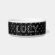 This gothic and minimalist dog feeding bowl for food or water features a pattern with mini skulls on a black background. Add your pet’s name for a one-of-a-kind ceramic dish that’s both microwave and dishwasher-safe. Whether you’re decorating for Halloween or gifting a new puppy owner, this USA-made dish brings festive charm to every mealtime. Available in two sizes: medium (25oz) and large (40oz), for kittens to adult felines. Available in two sizes, the medium one (25oz) is ideal for small to medium dogs like French Bulldogs, Shih Tzus, Boston Terriers, Pugs, and Cocker Spaniels. The large one (40oz) suits medium to large breeds like Labradors, Boxers, Bulldogs, and Golden Retrievers.
