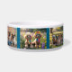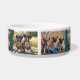 A dog bowl featuring seven breeds of dogs dressed as hippies. From left to right, the hippie dogs are Pugs, Poodles, French Bulldogs, Dalmatians, Rottweilers, Basset Hounds, and Boxers.