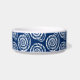 Pet bowl em um padrão de impressão de bloco, baseado em uma concha espiral, em branco sobre um fundo azul de cobalto