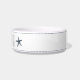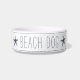 Uma tigela de cachorro de estilo costeiro bonito para sua casa de praia ou moradia insular exibe a palavra "cão de praia" em enfumaçado porto, em caracteres azuis, em letras de fundo branco, acentuadas com faixas estreitas de marinho e um par de estrelas-do-mar.
