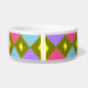 Esta incrível tigela de estimação tem um padrão de abstrato com filas de diamantes rosas e azuis. Cada fileira é separada por uma fileira de diamantes verdes escuros. Cada um dos diamantes verdes escuros tem um buraco no meio dele. Aqui está a parte divertida, você pode preencher aquele buraco com uma escolha de mais de 200 cores para fazer um design único. Aqui os buracos foram preenchidos com uma bela cor amarela como exemplo. Para selecionar sua cor e ver o efeito que ela tem no design simplesmente clique no botão "personalizar", vá para a seção de cores e clique no plano de fundo e escolha a cor que você quiser colocar no design. Você pode tentar tantas cores quantas quiser até encontrar a que funciona para você.