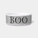 Esta tigela de alimentação de na moda para comida ou água apresenta um padrão falso de brilho prateado e a palavra "boo" em preto com aranhas e teias aranhas. Micro-ondas e máquina de lavar louça; ideal para decorar um canto alimentar de um animal de estimação para o Halloween trazer charme festivo a cada hora de refeição. Disponível em duas dimensões, média (25 oz) e grande (40 oz), para gatinhos para felinos adultos.