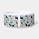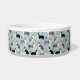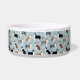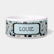 Pastores australianos lindos / tigela de cachorro australiano Aussie em casacos pretas, marrons e unidas sentam-se e ficam espalhados por ossos de cachorro e estampas em um fundo azul claro seu próprio nome de estimação personalizado.