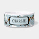 Cães Boxer bonitos sentam-se e posam-se com casacos brindle, branca e coroa, com ossos de cão espalhados e padrões de pegadas.