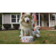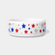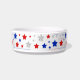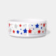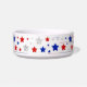 Uma tigela decorativa para animais adornada com estrelas vermelhas, brancas e azuis.