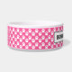 Esta tigela de pet tem uma pata de cachorro branca dentro de um círculo preto no meio. Ao redor dela, há duas áreas de texto personalizáveis que agora leem "jantar" e o nome do pet. O fundo tem um padrão de pegadas de cachorro brancas em uma cor rosa. A cor rosa pode ser alterada para qualquer outra cor sob personalização.