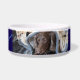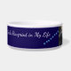 Este design de tigela de cerâmica para animais de estimação coloca a foto do seu companheiro no centro, com o nome e o apelido elegantemente exibidos à direita. À esquerda, a frase “Pegadas de Deus na minha vida” é combinada com uma trilha de pegadas azuis claras, equilibrando a composição com simbolismo sincero. Uma homenagem moderna e terna, ideal para pais de animais que prezam tanto a fé quanto a alegria do seu amigo peludo.