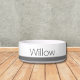 Um prato de estimação personalizado em tons de cinza e branco. O nome do seu animal de estimação está definido em uma fonte moderna de cinza acima de uma fronteira de coordenação de tons de cinza.