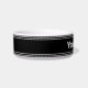 Esta tigela preta e branca de animais de companhia tem um texto branco no centro. Você pode editar o texto para um nome ou mensagem.