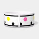 Bowls Personalizadas do Nome de Pet do Bolinhas. Bolinhas geométricas coloridas com bordas pretas e bordas cor-de-rosa, amarela, turquesa, pontos pretos contra fundo branco. Personalize o nome do animal de estimação em um quadro retangular amarelo brilhante e ensolarado com texto em preto. Formas circulares brilhantes e divertidas de tendências novas. Clique para personalizar e personalizar cores de pontos, se desejar. Design de arte original por TamiraZDesign. www.zazzle.com/tamirazdesigns