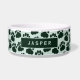 Nosso design de Pet Bowl Personalizável, Bonito e Moderno, imprime uma pintura personalizável, apresenta um padrão adorável de estampas bonitinhas em tons de verde-escuro, preto e azul em pó. Esta tigela de animais de estimação do estilo pop art pode ser personalizada atualizando o texto com o nome do seu amigo peludo.