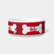 Osso e pata de cão branco com o nome do cão em fundo vermelho. O nome é editável. A cor de fundo pode ser alterada.