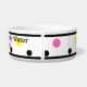 Personalize o nome do animal de estimação em texto preto dentro de uma área retangular amarela. A citação humorística Não esqueça de reabastecer minha água está escrita no lado oposto do nome. Pontos coloridos geométricos com acabamento de borda preta e pontos rosa, amarelo, turquesa e preto contra fundo branco. Obra de arte original e design de citação TamiraZDesigns.