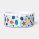 Uma tigela de animais de estimação colorida com estrelas-do-mar, conchas e seixos, erva-do-mar para o verão. Mergulhe no ritmo de sujeira das ondas com nosso padrão de ebulição de Ocean Beach. A tigela de estimação apresenta um padrão adorável inspirado pela beleza do oceano, adornada com delicadas conchas marinhas, estrelas, algas, gotas d'água e seixos. Cada elemento é intricadamente tecido no design, criando uma representação harmoniosa e visualmente atordoante da paisagem costeira. As tons brilhantes de azul, vermelho, amarelos e verdes imitam as cores do oceano, evocando um senso de calma e relaxamento e brisa fresca do mar. Deixe a beleza da praia elevar o seu animal de estimação todos os dias. O nome é personalizável para que você possa personalizar a tigela de estilo praia com o nome do animal de estimação ou outro texto.