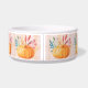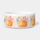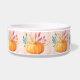 Uma tigela de animais de companhia personalizada com fundo listrado em rosa e ouro. Imagem repetida de uma abóbora cor d'água laranja com folhas coloridas.