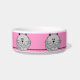 Esta bacia cerâmica feita sob encomenda bonito do animal de estimação tem um gato gordo cinzento dos desenhos animados sentar-se com suas patas dobradas abaixo e sua cauda envolvida ao redor, em um fundo cor-de-rosa. Há 4 delas em torno do prato.