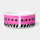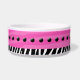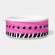 Uma tigela de comida de cão super fofa com uma faixa de zebra rosa, uma faixa de zebra branca e preta, pontos pretos e um osso de cão com o nome do seu cão no osso.