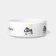 Uma Tigela de Pet Médio Branca de Cerâmica, com a opção de personalizar = " Nome do seu cão aqui! com desenhos de um cão de desenho animado, Tiffany e seu Frisbee, = 4 vezes ao redor da tigela, = (Arte de P.J.M.).