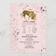 Um convite para o chá de fraldas com a ilustração de um tigre de bebê e mãe rodeado de pintura preta sobre o fundo da rosa claro.
