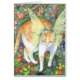 Um gato alaranjado e branco com as asas translúcidas verdes pálido empoleira-se em uma árvore com poucas flores do primavera. Arte por Carmen Medlin.
