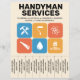 A professional handyman services flyer with tear-off tabs and colorful tiles layout featuring bold blue and orange color scheme. The center showcases a collection of icons including a wrench, hammer, paint brush, handsaw, water drop and a house. Fully customizable, it can be suitable for all kinds of repair activities such as handyman, home repair services, renovation, plumbing, drywall, painting, carpentry, etc.