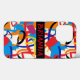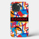 Formas coloridas, pintadas e linhas em vermelho, azul, laranja e ouro, em um fundo branco cria uma capa de telefone brilhante. Personalize com seu nome em vermelho em uma banda preta.