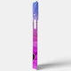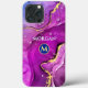 Um design de tinta vermelha-violeta e dourada com monograma amarelo personalizado e nome branco em círculo azul escuro e ouro.