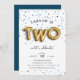 Adorável convite de festas para o seu pequeno segundo aniversário, "DOIS", escrito em balões de ouro, num fundo de confete azul. Personalize com seus segundos detalhes de festa de aniversário em uma combinação de letras caprichosas e modernas. Convites invertendo a azul marinho sólido.
