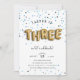 Adorável convite de festas pelo seu pequeno terceiro aniversário, "TRÊS", escrito em balões de ouro, sobre um fundo de confete azul. Personalize com a sua terceira festa de aniversário em uma combinação de letras brancas e modernas. Convites invertendo a azul marinho sólido.