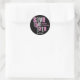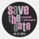 Guarde o adesivo de data para o casal que não tem medo de ser diferente. Sans serif negros em cor-de-rosa e sombras de cinza se destacam contra o fundo preto rico neste adesivo limpo, mas eficaz. Adicione seus nomes e data do evento. Perfeito para invólucros ou selos de embalagem ou para utilização em bolsas a favor. Disponível em cores alternativas com produtos correspondentes.